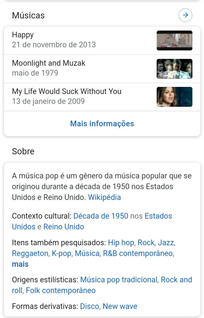 Entrando em “gênero musical pop”, apareceu uma breve descrição de pop e uma lista de músicas. Dentre elas temos ‘Happy’ do Pharrell Williams (que hitou até em Marte né) e uma música da Kelly Clarkson que eu nunca tinha ouvido.